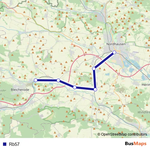 The first stop of the Rb57 bus route is Nordhausen and the last stop is