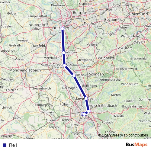 The first stop of the Re1 bus route is Köln Hbf (Breslauer Platz) and the last stop is Duisburg Hbf. Re1 is operational during täglich.