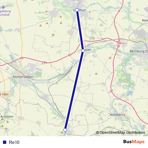 The first stop of the Re10 bus route is Staßfurt and the last stop is Sandersleben(Anh). Re10 is operational during täglich.