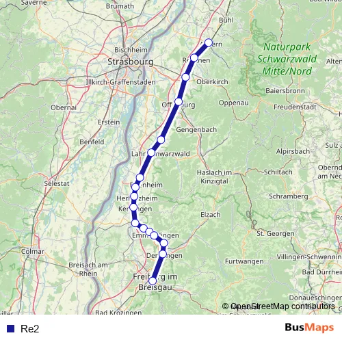 The first stop of the Re2 bus route is Bahnhof/Zob, Offenburg and the last stop is