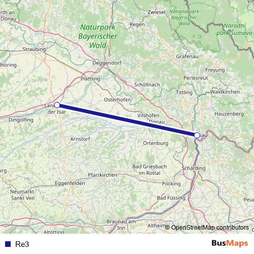 The first stop of the Re3 bus route is Landau (Isar) and the last stop is