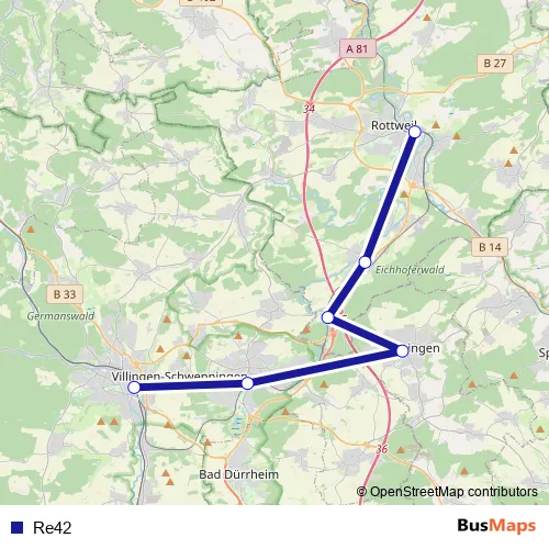 See why over 2 million users trust and consider busmaps.com as the best public transport website. busmaps gives you Villingen-Schwenningen Buses suggested routes, real-time bus tracker, line route maps in Villingen-Schwenningen, and helps to find the closest Re42 bus stops near you. No internet available? Download an offline PDF map and bus schedule for the Re42 bus to take on your trip.