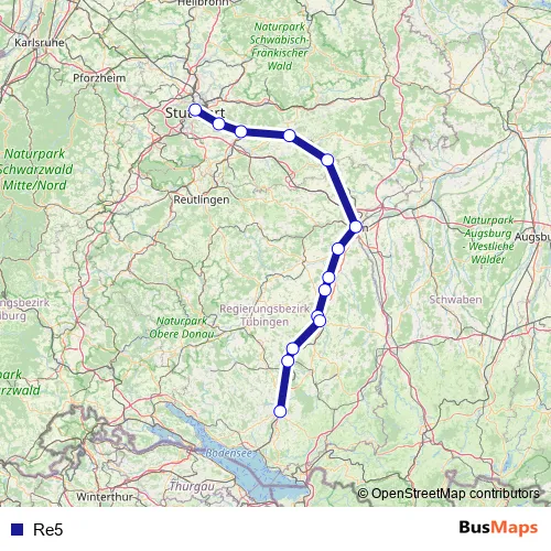 The first stop of the Re5 rail route is Stuttgart Hbf and the last stop is