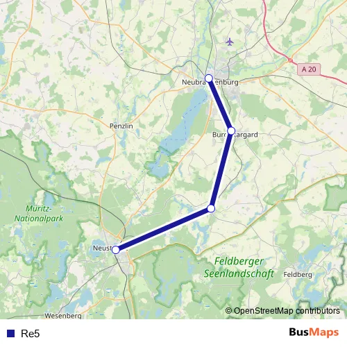 The first stop of the Re5 bus route is Neustrelitz Hauptbahnhof and the last stop is