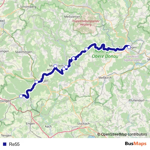 The first stop of the Re55 bus route is Donaueschingen ZOB Bstg 2 and the last stop is Villingen Bahnhof/ZOB Bstg C. Re55 is operational during am Wochenende.