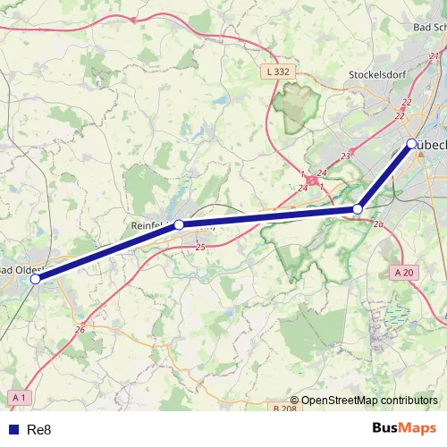 The first stop of the Re8 bus route is Lübeck ZOB/Hauptbahnhof and the last stop is Strandbahnhof. Re8 is operational during am Wochenende.
