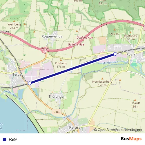 The first stop of the Re9 bus route is Berga-Kelbra and the last stop is
