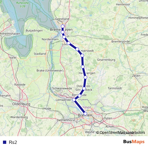 The first stop of the Rs2 bus route is Bremen Hauptbahnhof/Hugo-Schauinsland-Platz and the last stop is Bremerhaven Bahnhof Lehe. Rs2 is operational during am Wochenende.