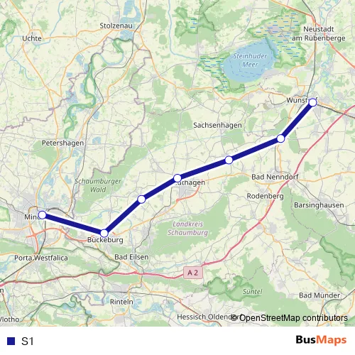 The first stop of the S1 bus route is Bückeburg and the last stop is Wunstorf. S1 is operational during täglich.