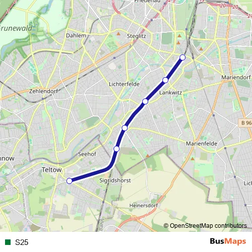 The first stop of the S25 rail route is S Teltow Stadt and the last stop is S Südende (Berlin). S25 is operational during täglich.