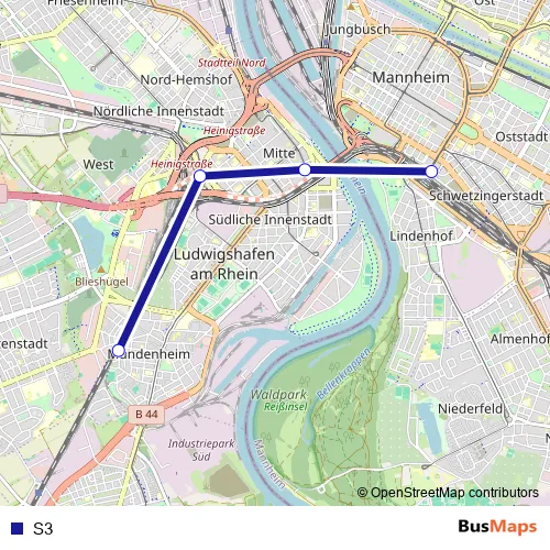 The first stop of the S3 bus route is Mundenheim Bahnhof, Ludwigshafen am Rhein and the last stop is Hauptbahnhof, Mannheim. S3 is operational during täglich.