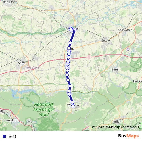 The first stop of the S60 bus route is Warstein, Markt and the last stop is Lippstadt, Nicolaiweg. S60 is operational during täglich.