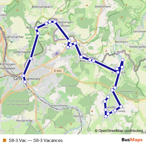 Rue Hermeskappel - Rue de la Chapelle - Rue des Jardins - Rue du Moulin - Rue Principale - Rue de Millery - Rue Gallo-Romaine - Rue Robert Schuman - Rue des Jardins - Rue Principale - Rue du Val de Blies - Rue de l'Église - Rue Principale - Rue des Écoles - Rue Principale - Avenue de la Blies - Rue Charles Utzschneider - Rue de Chasseneuil