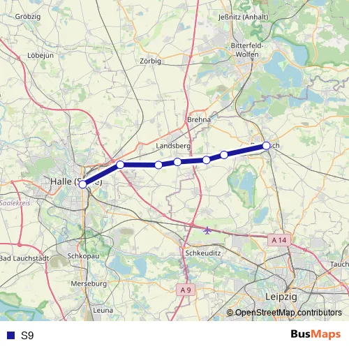 The first stop of the S9 bus route is Halle (Saale), Hauptbahnhof/Zob and the last stop is