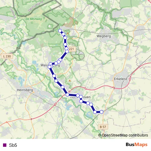 The first stop of the Sb5 monorail route is Wegberg, Dalheim Bahnhof (Bus) and the last stop is Hückelhoven, Baal Bahnhof (Bus). Sb5 is operational during an Werktagen.