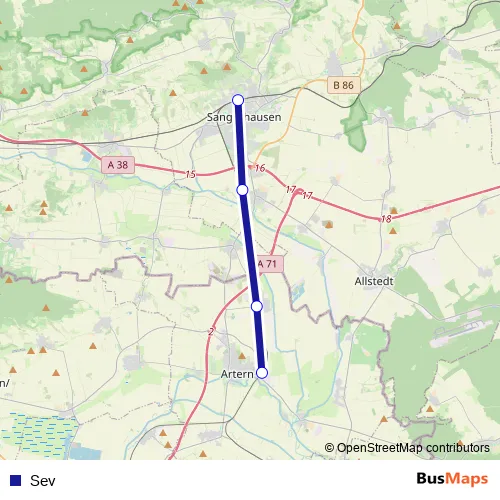 The first stop of the Sev bus route is Sangerhausen and the last stop is Artern. Sev is operational during täglich.