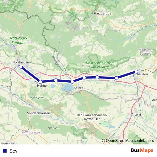 The first stop of the Sev bus route is Berga-Kelbra and the last stop is Leinefelde. Sev is operational during täglich.