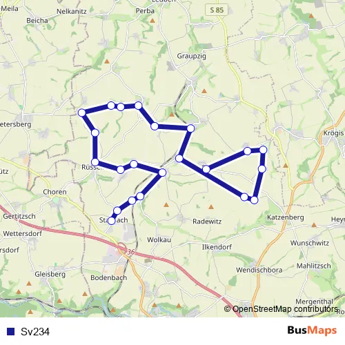 The first stop of the Sv234 bus route is Raußlitz Grundschule and the last stop is Starbach Dorfplatz. Sv234 is operational during an Werktagen.