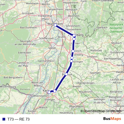 The first stop of the T73 rail route is Mannheim Hbf and the last stop is