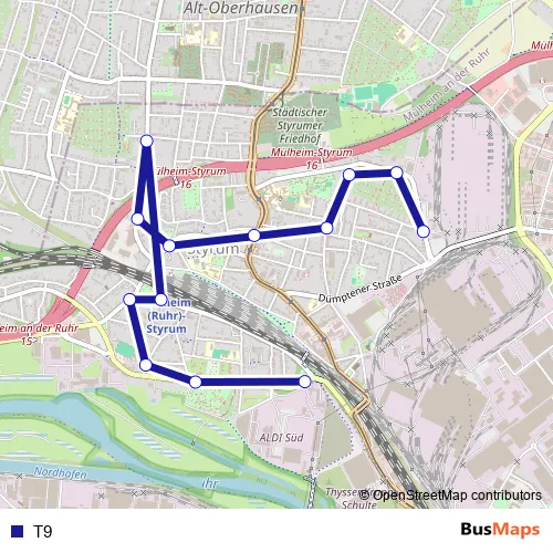 See why over 2 million users trust and consider busmaps.com as the best public transport website. busmaps gives you Oberhausen Buses suggested routes, real-time bus tracker, line route maps in Oberhausen, and helps to find the closest T9 bus stops near you. No internet available? Download an offline PDF map and bus schedule for the T9 bus to take on your trip.