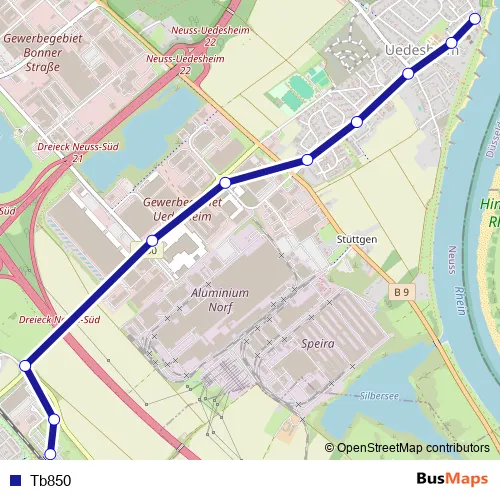 The first stop of the Tb850 bus route is Neuss Deichstr. and the last stop is