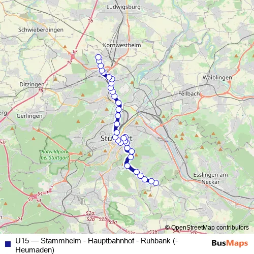 Tram U15 - Stammheim - Hauptbahnhof - Ruhbank (- Heumaden) in Stuttgart: Stops & Timetable