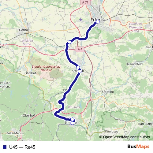 The first stop of the U45 rail route is Ilmenau and the last stop is