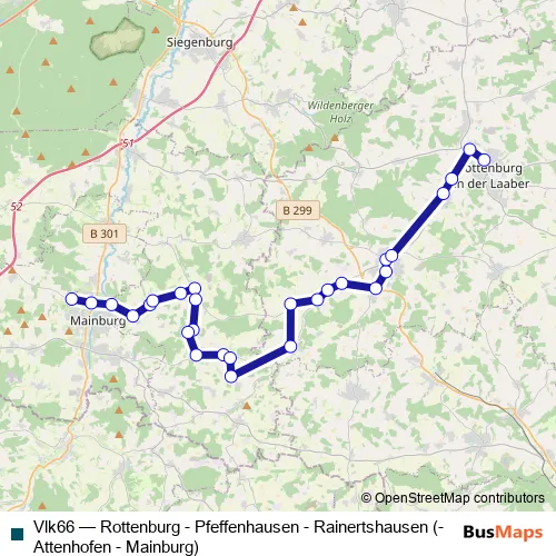 The first stop of the Vlk66 bus route is Mainburg, Schulzentrum and the last stop is Rottenburg, Bahnhof. Vlk66 (Rottenburg - Pfeffenhausen - Rainertshausen (- Attenhofen - Mainburg)) is operational during täglich.