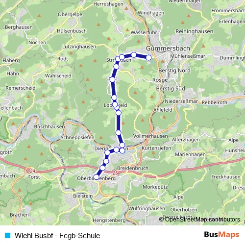 Gummersbach Steinenbrück Fcgb-Schule. Wiehl Busbf - Fcgb-Schule (Wiehl Busbf - Fcgb-Schule) is operational during an Werktagen.