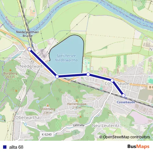 The first stop of the alita 68 bus route is Cossebaude Bahnhof and the last stop is Niederwartha Haltepunkt. alita 68 is operational during täglich.