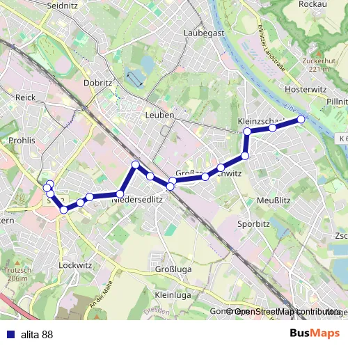 The first stop of the alita 88 bus route is DD Fährstelle Kleinzschachwitz and the last stop is Dresden Prohlis Gleisschleife. alita 88 is operational during täglich.