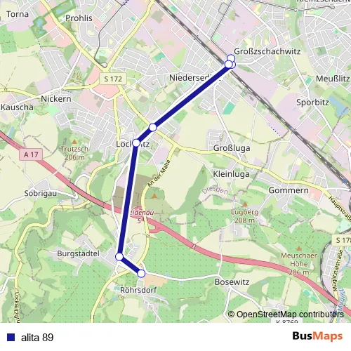 The first stop of the alita 89 bus route is Röhrsdorf (b Pirna) Am Landgut and the last stop is Dresden S-Bahnhof Niedersedlitz. alita 89 is operational during täglich.