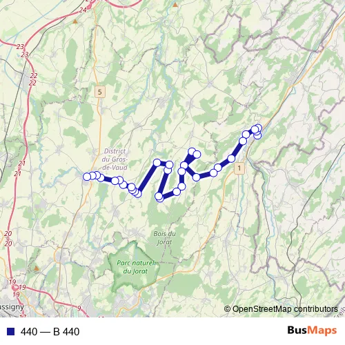 Place de la Gare - Avenue de Lucens - Avenue de Bussy - Route d'Hermenches - Place de la Croisée - Route de la Moille Robert - Le Moulin de Peney - Route de Peyres-Possens - Route de la Poudrière - Route de Peney - Route de Villars-Mendraz - Route de Villars-Tiercelin - Route Derrey la Vela - Rue des Fontaines - Route de Bellevue - Route du Temple - Rue du Village - Route d'Echallens - Route d'Oron - Route de Sugnens - Route de Moudon - Chemin du Grand Record