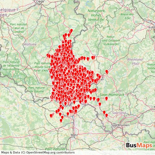 Régime Général des Transports Routiers operates in the following cities: Luxembourg, Wiltz, Esch-sur-Alzette, Diekirch, Redange-sur-Attert, Clervaux, Grevenmacher, Mersch, Petange, Dudelange, Ettelbruck, Rumelange, Troisvierges, Differdange, Niederanven, Bech, Capellen, Mondorf-les-Bains, Weiswampach, Echternach, Remich, Rosport, Consdorf, Junglinster, Kopstal, Mamer, Schuttrange, Steinfort, Wormeldange, Bascharage, Beaufort, Boulaide, Hosingen, Bettembourg, Garnich, Kayl, Leudelange, Strassen, Bettborn, Contern, Dippach, Hesperange, Koerich, Merzig, Mondercange, Roeser, Sandweiler, Vianden, Waldbillig, Walferdange, Wincrange, Bous, Dalheim, Heffingen, Niederfeulen, Reckange-sur-Mess, Schieren, Schifflange, Vichten, Wahl, Weiler-la-Tour, Bastogne, Bertrange, Biwer, Boevange-sur-Attert, Bourscheid, Flaxweiler, Herserange, Hobscheid, Larochette, Lintgen, Longwy, Lorentzweiler, Losheim, Mompach, Saeul, Schengen, Septfontaines, Steinsel, Thionville.