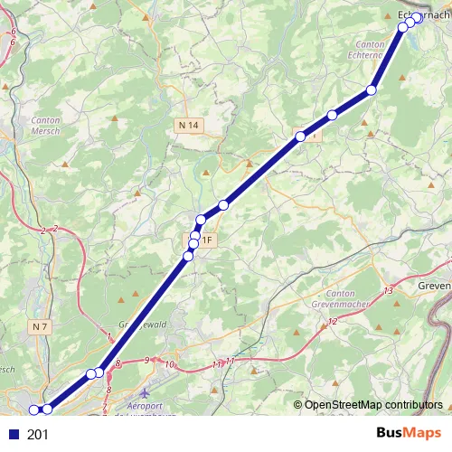See why over 2 million users trust and consider busmaps.com as the best public transport website. busmaps gives you Echternach Buses suggested routes, real-time bus tracker, line route maps in Echternach, and helps to find the closest 201 bus stops near you. No internet available? Download an offline PDF map and bus schedule for the 201 bus to take on your trip.