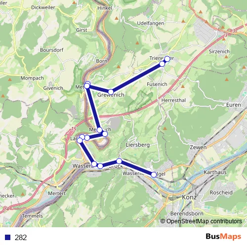 Kürenzer Straße - An der Schellenmauer - Mustorstraße - Konstantinplatz - Weberbach - Saarstraße - Matthiasstraße - Bahnhofstraße - Moselstraße - Wasserbilliger Straße - Mesenicher Straße - Trierer Straße - Hauptstraße - Römerstraße - Trierweilerstraße - Schulstraße