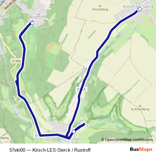The first stop of the 57eki00 bus route is Kirsch-LES-Sierck - Centre and the last stop is Kirsch-LES-Sierck - Ecole. 57eki00 (Kirsch-LES-Sierck / Rustroff) is operational during täglich.