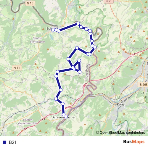 The first stop of the B21 bus route is Grevenmacher, Gare routière and the last stop is Echternach, Gare Centre. B21 is operational during an Werktagen.