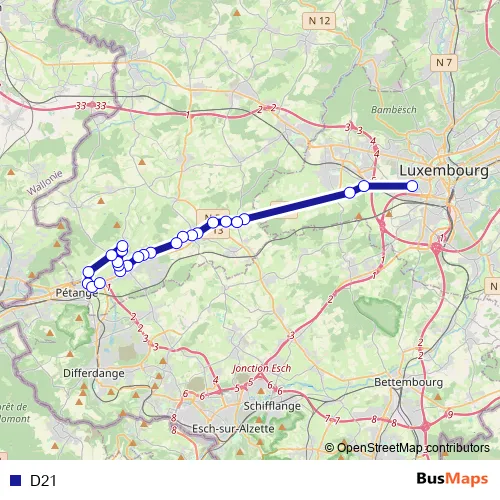 See why over 2 million users trust and consider busmaps.com as the best public transport website. busmaps gives you Bascharage Buses suggested routes, real-time bus tracker, line route maps in Bascharage, and helps to find the closest D21 bus stops near you. No internet available? Download an offline PDF map and bus schedule for the D21 bus to take on your trip.