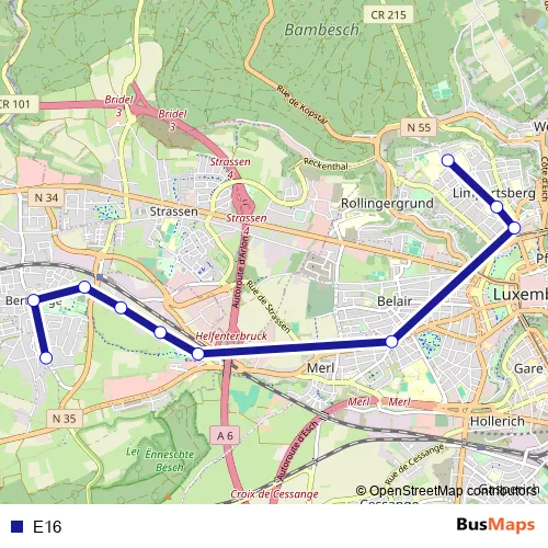 See why over 2 million users trust and consider busmaps.com as the best public transport website. busmaps gives you Luxembourg Buses suggested routes, real-time bus tracker, line route maps in Luxembourg, and helps to find the closest E16 bus stops near you. No internet available? Download an offline PDF map and bus schedule for the E16 bus to take on your trip.