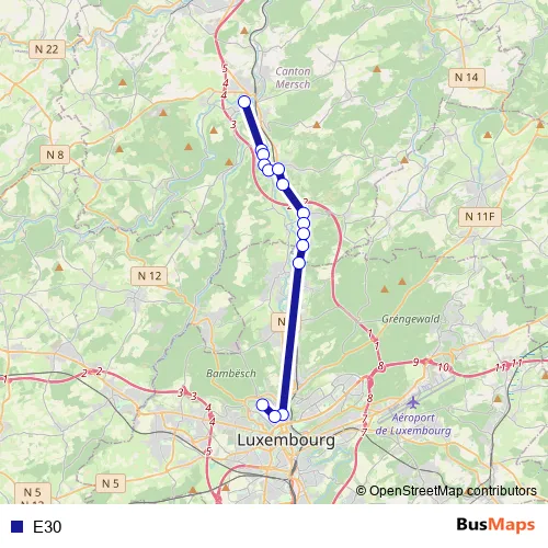 The first stop of the E30 bus route is Mersch, Maartplaz and the last stop is Limpertsberg, L.T.C.. E30 is operational during an Werktagen.