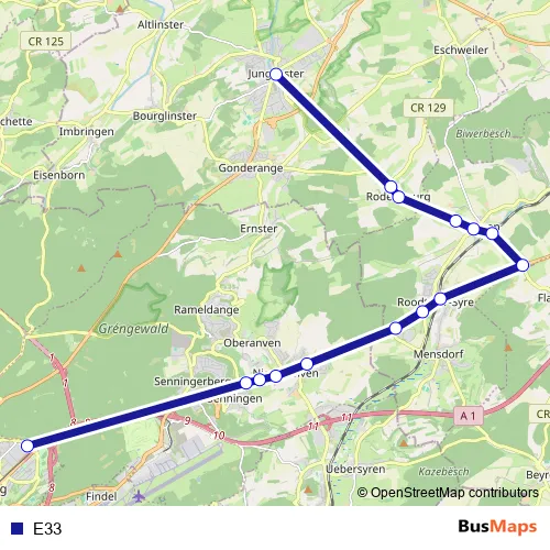 The first stop of the E33 bus route is Junglinster, Op der Gare and the last stop is Kirchberg, Gare routière Luxexpo. E33 is operational during an Werktagen.
