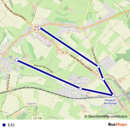 The first stop of the E43 bus route is Sprinkange, Place de l'Eglise and the last stop is Dippach, Op der Kopp. E43 is operational during an Werktagen.