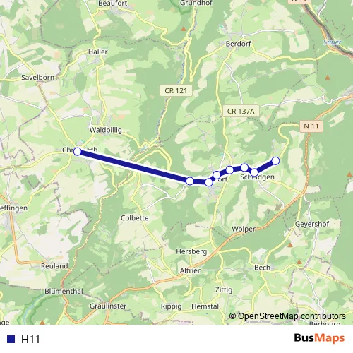 The first stop of the H11 bus route is Christnach, Schoulstrooss and the last stop is Scheidgen, Biweschland. H11 is operational during an Werktagen.