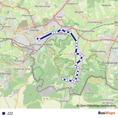 The first stop of the J22 bus route is Esch-sur-Alzette, Lycée Hubert Clement and the last stop is Rumelange, Rembour. J22 is operational during an Werktagen.