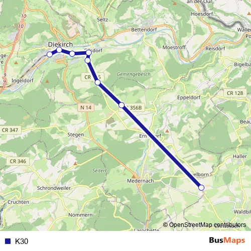 The first stop of the K30 bus route is Diekirch, Gare routière and the last stop is Waldbillig, Scheedhaff. K30 is operational during an Werktagen.