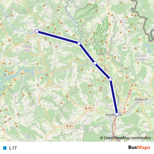 The first stop of the L17 bus route is Ettelbruck, Gare routière and the last stop is Kautenbach, Gare routière. L17 is operational during am Wochenende.