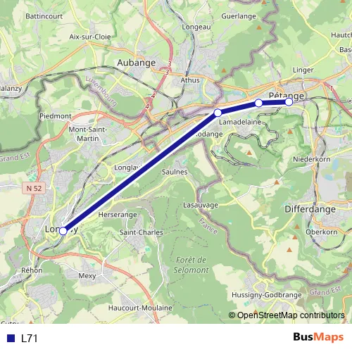 The first stop of the L71 bus route is Pétange, Gare routière and the last stop is Longwy, Gare routière. L71 is operational during täglich.