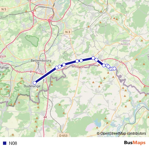 The first stop of the N08 bus route is Dudelange, Lycée Nic Biever and the last stop is Mondorf-les-Bains, Christophorus. N08 is operational during an Werktagen.