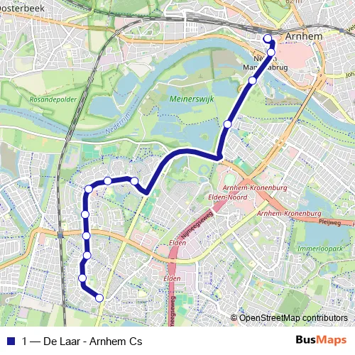 The first stop of the 1 bus route is Arnhem, Centraal Station [ M ] and the last stop is Arnhem, De Laar/Bredasingel. 1 (De Laar - Arnhem Cs) is operational during täglich.